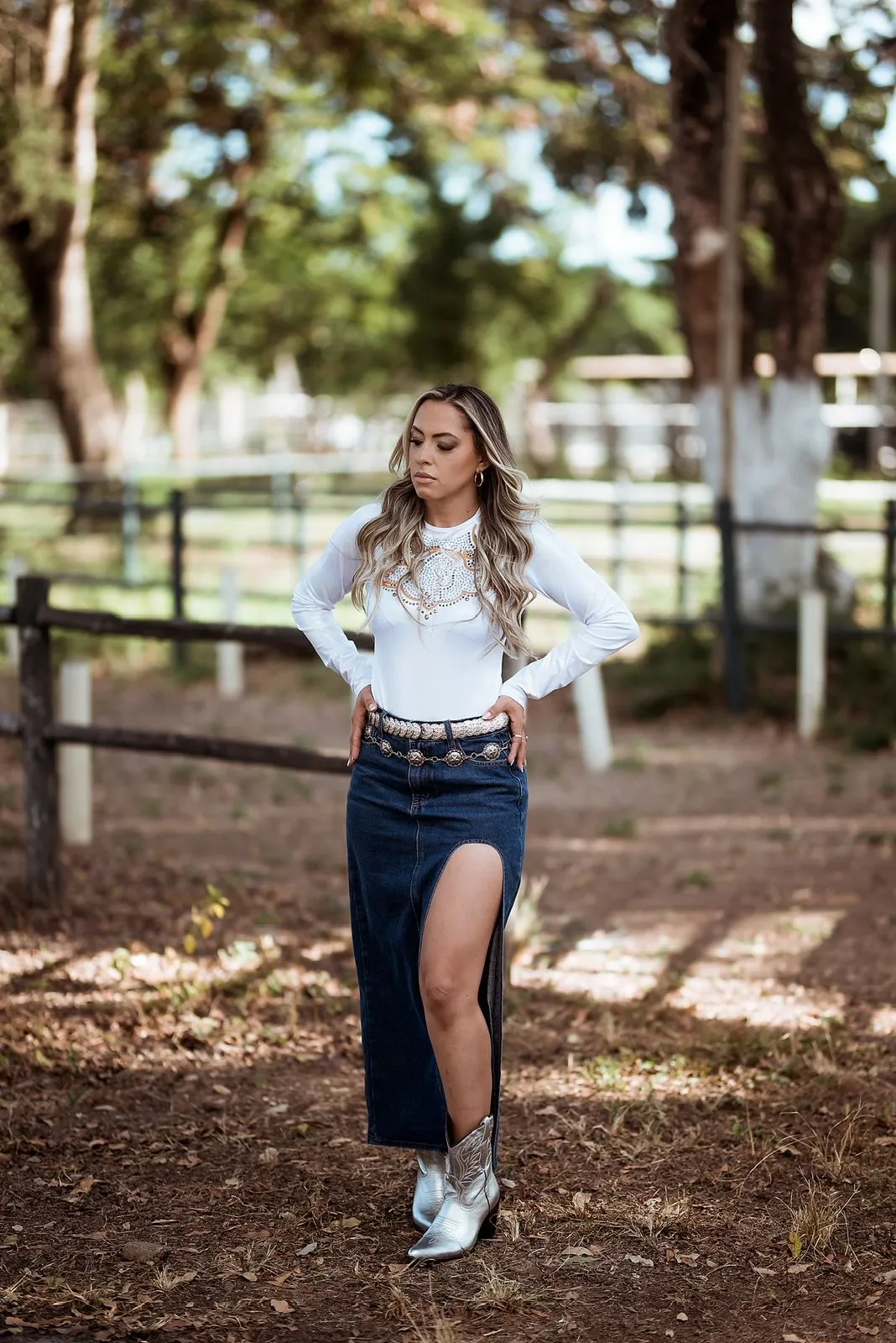 Saia jeans feminina estilo country, com lavagem escura e fenda frontal que valoriza a silhueta e garante conforto ao caminhar. Uma peça moderna e versátil, ideal para compor looks com botas, cintos e chapéus, transitando com facilidade entre o casual e o country elegante. Perfeita para eventos, cavalgadas, rodeios ou produções do dia a dia com personalidade e atitude.